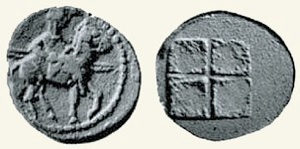 Obverse: Mounted horseman wearing a petasus, carrying two spears in this left hand