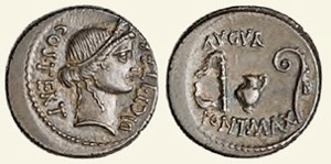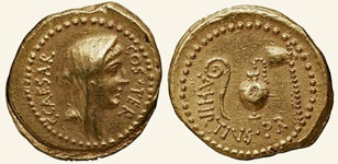 Roberta Stewart (referenced below, at p. 108) observed that the coin illustrated above was the first coins minted by a named moneyer in Rome that included Caesar’s name, and that it belonged to: