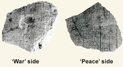 Mesalim, king of Kish, at the command of Ishtaran, [originally] demarcated this border and erected a monument there. Ush, ensi of Umma, acted arrogantly: he smashed that monument and marched on the plain of Lagash. Ningirsu, warrior of Enlil, by (Enlil's) just command, did battle with Umma. ... Eanatum, ensi of Lagash, demarcated the border with Enakale, the ensi of Umma. ... He inscribed (and erected) monuments at [the god-given border] and restored the monument of Mesalim, but did not cross [the border] into the plain of Umma”, (RIME 1.9.5.1; P431117, lines 1-58).