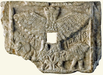 “Three very similar wall plaques of Ur-Nanshe from Girsu, [all of which] depict an Anzu bird standing on two lions.”