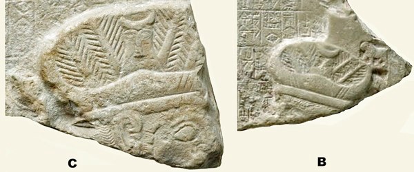 “As soon as the [relief] was found, [this headgear] was interpreted ... as a crown with two large feathers ... Although this interpretation has been questioned, ... it is almost certainly the right one. ... The similarity between the chevron-like form of: