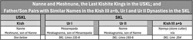 “Is it possible ... that Nanne and Meshnune [of the USKL] are, in fact Mesanepada and Meskiagnuna of Ur, whom [the author of the original SKL] classified as Kishite rulers because Mesanepada held the title of [king of Kish]. If so, then [SKL author’s] decision would be fully justified.”