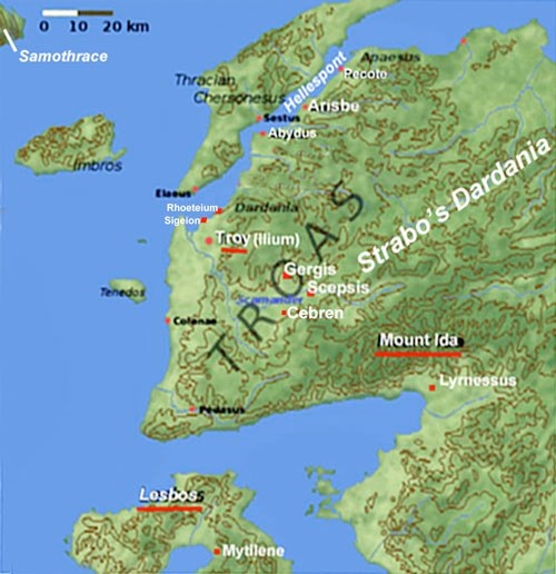 “... in order to gratify the Ilians ... , Hellanicus agrees with them that the present Ilium is the same as the ancient [city of Troy]”, (‘Geography’, 13: 1: 42).