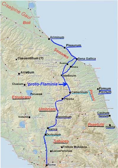 Blue road (‘proto-Flaminia’ = most convenient route from Rome to the Adriatic coast in 295 - 220 BC