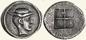 “The evolution of the reverse with the quadripartite square by its inclusion, together with the name of the [issuer], in an incuse square is observed in the issues of Alexander, Getas, the Bisaltae [and Mosses, as well as in the civic issues of] Acanthus and Abdera.”