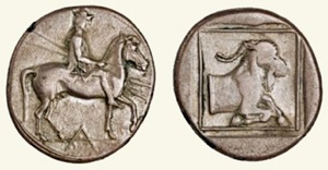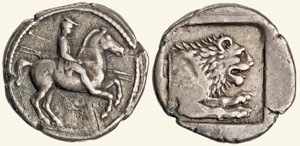 An example a rare type of these coins in the collection of Alpha Bank , Greece (collection ref. no.: 1218, 26.96 gm.) depicts a domesticated dog walking next to the horse, which seems to suggest that horseman was not intended to be seen as a military figure.