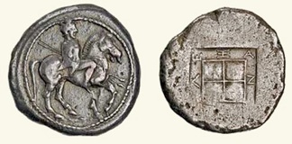 She also noted that, unlike the reverse type used on the ‘octadrachms’, which, as we have seen, always involve a four-part incuse square (either anepigraphic or ‘signed’), that used the tetradrachms: