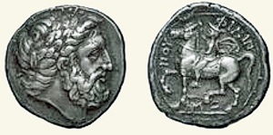 Philip introduced the head of the laureate Zeus to the coinage of Macedonia when he used it for his early tetradrachms. The image of Zeus on these coins is extraordinarily refined and might well have been inspired by the similar obverses that had recently been struck at Elis for the 105th Olympiad in 360 BC: