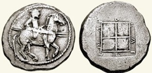 Obverse: Mounted horseman wearing chlamys (cloak) and petasos, and holding two spears in his right hand