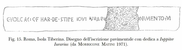 “Iuppiter Iurarius (apparently, a shrine) is known only from a dedicatory inscription [CIL VI 379] made of white stones in a pavement of opus signinum that was found in 1854 under the cloister of San Giovanni Calibita in the northern part of the [Tiber Island] ... ”