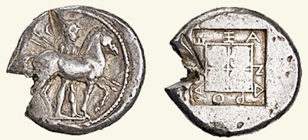 ✴this honour should go to the more refined reverses of Raymond’s Group II ‘standing horseman octadrachms‘ Alexander, which are assigned ‘with a fair degree of probability’ to ca. 475/6 BC.
