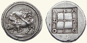 Reverse: AKANΘION (of Acanthus), inscription surrounding a quadripartite square within an incuse square