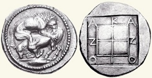 Obverse: Lion attacking a bull (the civic symbol of Acanthus), symbol of a fish below