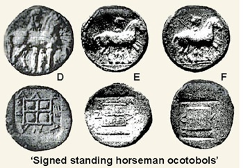•9 ‘signed’ tristaters [= ‘0ctadrachms’] of the Bisaltae (all having ‘signed standing horseman’ obverses);