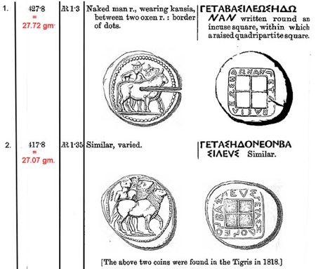 Alexandros Tzamalis (referenced below) catalogued two ‘signed two oxen octadrachms’ of Getas that had probably been represented in the Karkemish Hoard, both of which (like the ‘Getas’ coins from the Elmali Hoard - see above) had the inscription surrounding a quadripartite square within an incuse square: