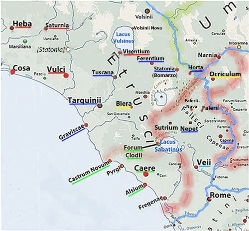 Latin colonies: Nepete and Sutrium (383 BC); Cosa (273 BC); Heba ? (ca. 150 BC)