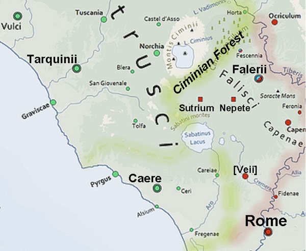 “... may be an exaggeration, Rome certainly [confiscated] land from Falerii upon which the Latin colonies of Nepete and Sutrium were later established [see below]. These operations gave [Rome] control of the area between the Tiber and the Ciminian Mountain ... .”