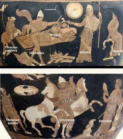 “... the fourth narrative talks about ... Strymon, who ruled the Thracians and gave his name to the river formerly known as Eioneus. He had three sons, Brangas and Rhesus and Olynthus. Rhesus went to fight alongside Priam at Troy and was killed by Diomedes”, ‘Bibliotheca’, 4).