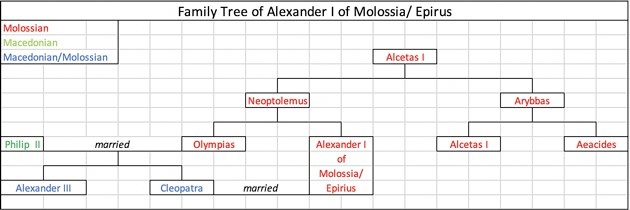 As indicated in the family tree above, Alexander was the son of Neoplotemus I of Molassia. The most important event in his life occurred in 357 BC, when his (probably older) sister, Olympias, married Philip II of Macedon in 357 BC. At this time, Neoplotemus was dead, and it was their uncle, King Arybbas, who arranged Olypias’ diplomatic marriage (since Philip was the enemy of his enemies, the Illyrians to the north). Olympias, who was probably Philip’s fifth wife (see below), probably improved her position at the (polygamous) Macedonian court, probably in the first year of the marriage, by giving birth to a son, Alexander, whom we know as Alexander the Great.