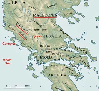 Epirus is the name given to the territory in the northwest of ancient Greece that lay between Macedonia and the Ionian Sea. It was inhabited by a number of tribes, the most important of which (at least by the 4th century BC) were the Molossians, the Chaonians and the Thesprotians. As Elizabeth Meyer (referenced below, 2014, at p. 302) pointed out: