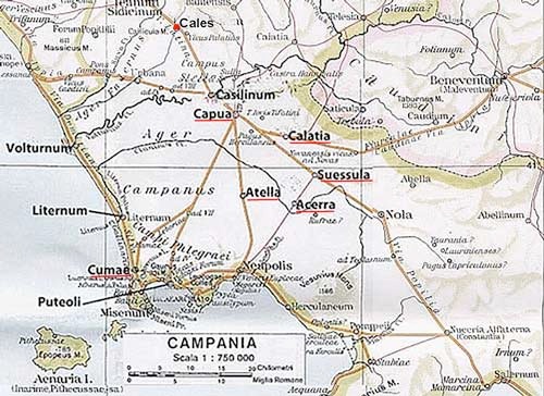 The defections of Capua, Atella and Calatia noted above would have been particularly dangerous, given the fact that the inhabitants here were Roman citizens: Capua was of particular importance, since both the Via Latina and the Via Appia linked it directly to Rome. Fortunately, Fabius had established a garrison in 216 BC at nearby Casilinum, which occupied a strategic position at the junction of the Via Latina and the Via Appia, on the site of the bridge over the Vollturnus. Furthermore, the town was still occupied by a small body of Roman troops (consisting principally of Latins from Praeneste, and Etruscans from Perusia), that had been en route for Cannae at the time of the battle there. Marcellus established a base here, probably after he had been relieved at Canusium on Varro’s return there (see above).
