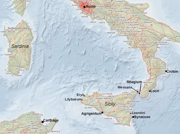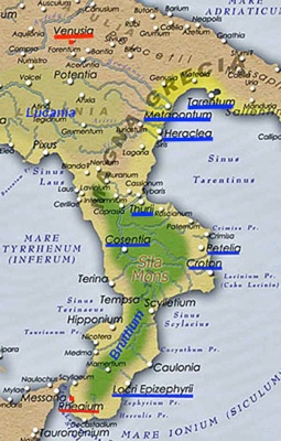 Blue = Carthaginian gains in 215 BC; Red = Rhegium, which remained loyal to Rome