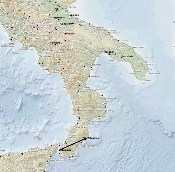 He also sent a message to the commander of the garrison from Sicily that was now stationed at Rhegium (see above), ordering him to take these men into Bruttium, where they should devastate the country and then attack the city of Caulonia.