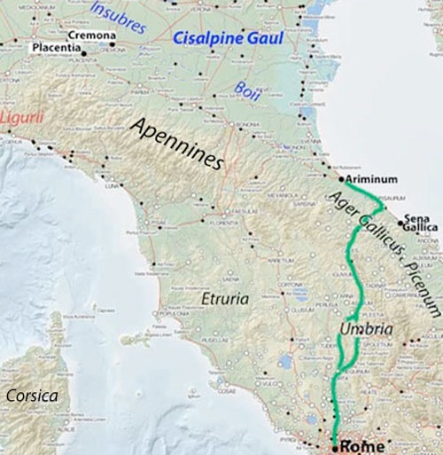 Green = Via Flaminia, from Ariminum to Forum Flaminii, according to itineraries from the imperial period