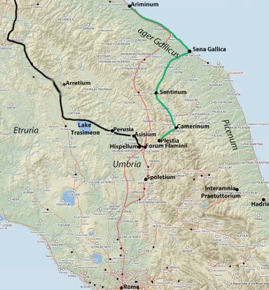 “... prone to all manner of error and confusion, he need not be accused of ‘inventing’ the [otherwise undocumented] lake of Plestia. The very oddity of the detail inspires a certain confidence. How the story came to include the lake baffles conjecture. Perhaps Centenius had marched [from Ariminum] not by the Flaminia [shown in red in the map below], but by the Camerinum road [to Plestia].”