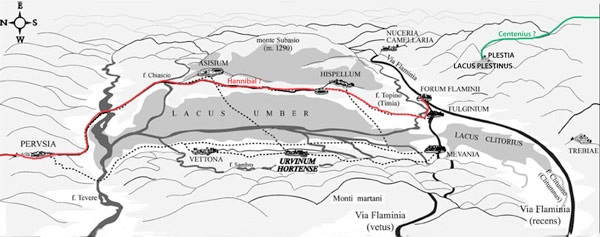 In order to pursue these hypotheses further, we need to examine Hannibal’s route after his victories over Flaminius and Centenius. Both Polybius and Livy have him marching into Umbria, and there is circumstantial evidence that he did so by following the northern shore of the lacus Umber, below Monte Subasio: