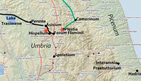 ✴Paul Fontaine (referenced below, at p. 39) described a Roman road that linked Perusia to Asisium and Hispellum, from which point he could easily have reached either Picenum (via the Apennine pass at Plestia) or Spoletium; and
