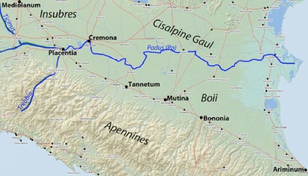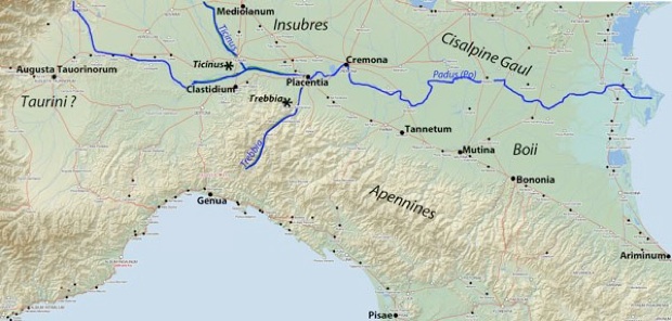 “... the Boii came to [Hannibal] and delivered up to him the three Roman officials [who had been] charged with the partition of their lands, whom they had captured a few months earlier at Placentia]. Hannibal welcomed their friendly advances and made a formal alliance with them ... However, he gave the three Romans back to them, advising them to [use] them to get their own hostages back, as had been their original design. [Scipio] was much concerned at this act of treachery, and ... in consequence, ... marched towards the river Trebbia and the hills in its neighbourhood, relying on the natural strength of the country and the loyalty of the neighbouring allies. ... [When Hannibal followed in his footsteps, Scipio crossed] the Trebbia, encamped on the first hills that he reached, fortified his camp... [and] awaited the arrival of [Sempronius]”, (‘Histories’, 3: 67:8- 68:6).