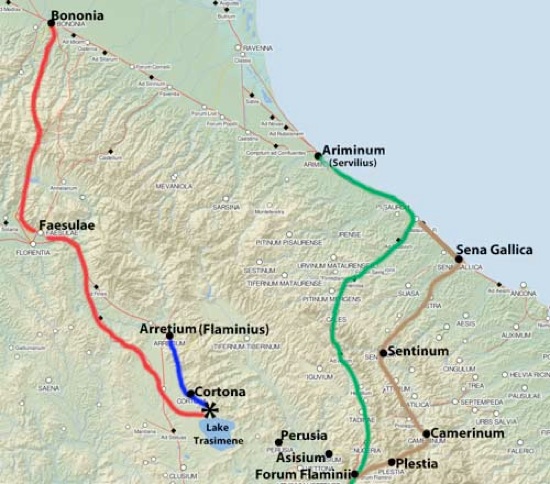 Red= Hannibal’s likely route from Cisalpine Gaul to Lake Trasimene
