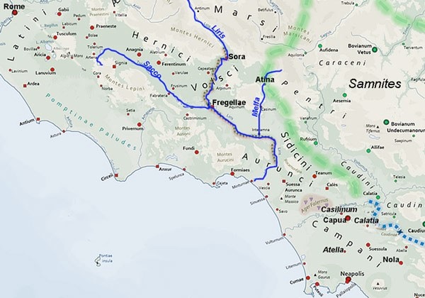 “... perhaps the Samnites, [having taken Sora, were able] to make their way [along the Liris river, passing Fregellae, which they already controlled, and to] reach the coast because the Romans had weakened their own defences on the Liris by driving into Samnium and Apulia.”