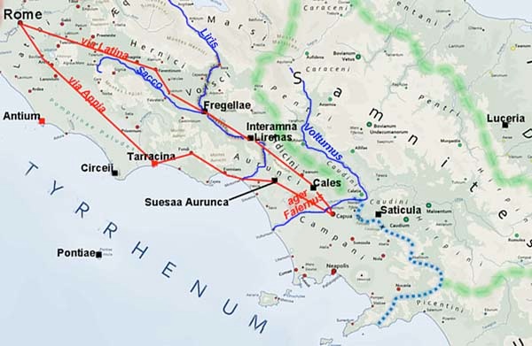 As described in my page Between First Two Samnite Wars II (337 - 328 BC), the Ausones, who seem to have been ethnically related to the Aurunci, were based around Cales, a strategically-located stronghold that had fallen to the Romans in 335 BC and been used for the foundation of a Latin colony in the following year. It is possible that the Romans had withdrawn from Cales under the terms of the Caudine Peace.