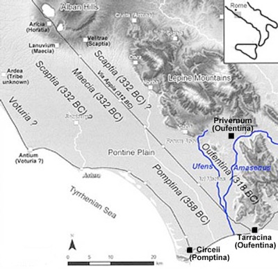 “The Oufentina [tribe], named for the river Ufens, was in the territory of Privernum, much of which had been had been in Roman possession certainly since 329 BC [and probably since 340 BC]. ... the tribe would have been made up of confiscated territory, assigned largely to Roman citizens. The Privernates, after a period of partial rights, were eventually registered in the Oufentina.”
