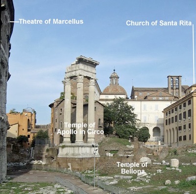 “... in front of the only ... temple [of Apollo] in Rome, on the site where, for that very reason, the stone theatre of Marcellus was later built.”