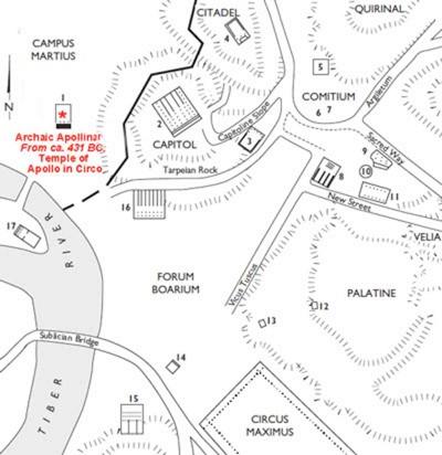 “... was not the temple of Apollo on the Palatine, for that was erected by [Octavian, who became the Emperor Augustus in 27 BC. The] temple [to which Cicero referred] was the one outside the Porta Carmentalis, between the Forum Holitorium and the Circus Flaminius. This was the only temple of Apollo at Rome at this time.”