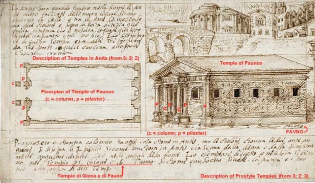 The sheet illustrated above might throw some light on the matter. It was one of eight sheets from the manuscript draft of an Italian edition of Vitruvius’ ‘On Architecture’ that were acquired by the Metropolitan Museum, New York, in 2007 BC, as recorded by Carmen Bambach (referenced below). She attributed them a member of the Sangallo family and dated them to 1530-50. This sheet illustrates the temple of Faunus (identified at the lower right) in front of one of the the bridges of the Tiber Island, with its floor plan to the left. The text below summarises Vitruvius’ description of prostyle temples (albeit that the form of the temple, as he represented it, has only two columns in front of the facade, as opposed to the Vitruvian four). In this Italian text, Vitruvius’ Roman example of this style is rendered as ‘[il] Tempio di Giove e di Fauno’, suggesting that ‘Sangallo’, like Ziolkowski and Richardson above, assumed that Vitruvius gave this dedication to the temple that was generally known as the temple of Faunus. (Unfortunately, I am unable to read the most of Italian text in the bottom box, which might throw further light on how ‘Sangallo’ interpreted this passage).