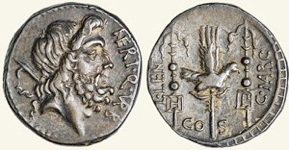 This explains why the urban quaestor Cn. Nerius chose the head of Saturn for the denarius (RRC 441/1, illustrated above) that he issued in 49 BC and depicted on the reverse the legionary standards that were kept in the aerarium there.