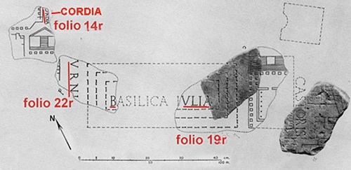 This location is supported by a number of literary references to it (discussed below) and by one and possibly two Renaissance drawings of now-lost fragments of the Severan Forma Urbis Rome (now published on-line by Stanford University) that are shown as folios 14r and 22r on the reconstruction above: