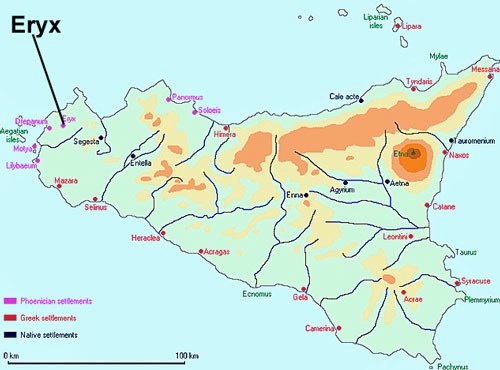 “Junius, returning to the army after the shipwreck in a state of great affliction, ... [was] most anxious to make good the loss inflicted by the disaster. Therefore, as soon as a slight opportunity arose, he surprised [the Carthaginians] and occupied Eryx, taking possession of both of the temple of Aphrodite [Roman Venus] there and of the town. Eryx is a mountain on the sea , ... situated between Drepana and Panormus ... . On its summit, which is flat, stands the temple of Aphrodite of Eryx, which is indisputably the first in wealth and general magnificence of all the Sicilian holy places. The city extends along the hill under the actual summit, the ascent to it being very long and steep on all sides. [Junius] garrisoned the summit and also the approach from Drepana, and jealously guarded both these positions, especially the latter, in the conviction that, by this means, he would securely hold the city and the whole mountain”, (‘Histories’, 1: 55: 5-9).