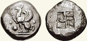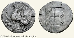 ✴the Teians began minting before the Abderites, using the Milesian standard (based on the stater of Miletus of 14.15 gm.); and