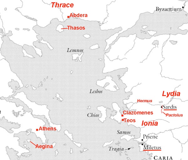 “... took [the] walled city [of Teos] by building earthworks, [by which time], its population had sailed to Thrace, where they founded the city of Abdera: this city had originally been founded by Timesius of Clazomenae, but he had been driven out by the Thracians. ... [The Teians] who were the only Ionians who [refused to accept the slavery that would have followed Harpagus’ invasion], left their native lands, ... and, when Harpagus had conquered the Ionians of the mainland, the Ionians of the islands, fearing the same fate, surrendered themselves to Cyrus”, (‘Persian Wars’, 1: 168-9).