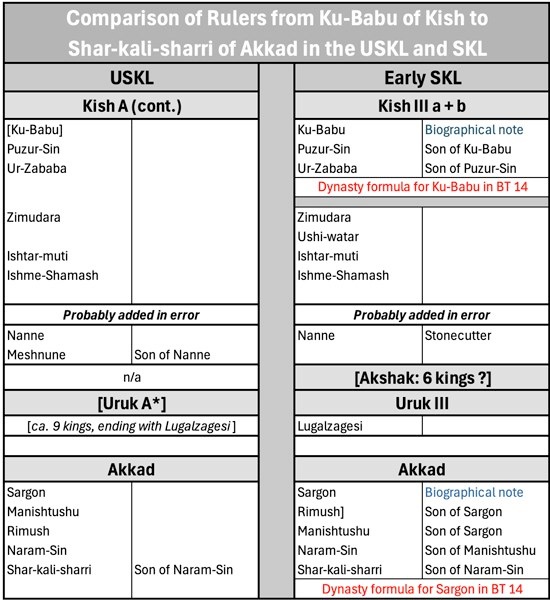 Gösta Gabriel (referenced below, 2023, at p. 244-5) similarly argued that the USKL must have been preceded by an Old Akkadian recension that included the ‘Kish A’ and ‘Uruk A*’ kings, to which the names of Sargon and his Akkadian successors were added. However, he also argued that: