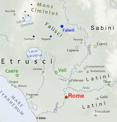“... dominated by Etruscan influence and culture, and her relationship with Veii must have been particularly close. However, because both cities wished to control the trade route up the Tiber, they clashed often in the 5th century BC.”