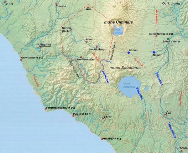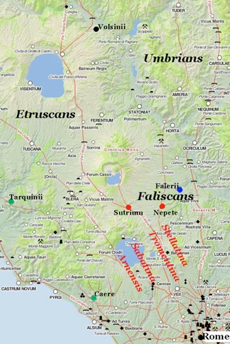 Red dots = Latin colonies of Sutrium and Nepete, founded in ca. 383 BC