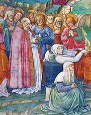 According to Giorgio Vasari, the Commune had asked Cosimo de' Medici to persuade Filippo Lippi to take on this project. Cosimo died in 1463, but it is possible that his aid had been sought shortly before this. Given his close interest in the work, Bishop Cardinal Berardo Eroli must have been involved in securing the commission, perhaps through his contacts with Bishop Antoninus Pierozzi of Florence and Giuliano de' Medici. Antoninus Pierozzi, who had died in 1459, is depicted among the Apostles in the central fresco, wearing a red cloak reading from the Book of Psalms. This might have been due to the influence of Lorenzo de' Medici, who was pressing for the canonisation of Antoninus Pierozzi in the 1460s. (He was finally canonised in 1523).