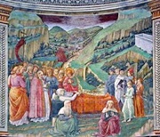 Filippo Lippi introduced a self-portrait in the central scene: he wears his Carmelite habit and stands among his colleagues. His son, Filippino is depicted as an angel. Filippo Lippi died in late 1469 and his colleague completed the work in 1470.