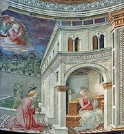 The scene on the left depicts the Annunciation. The Virgin is seated in a loggia as the Angel Gabriel makes his announcement and God the Father appears in the sky to the left to effect the incarnation.